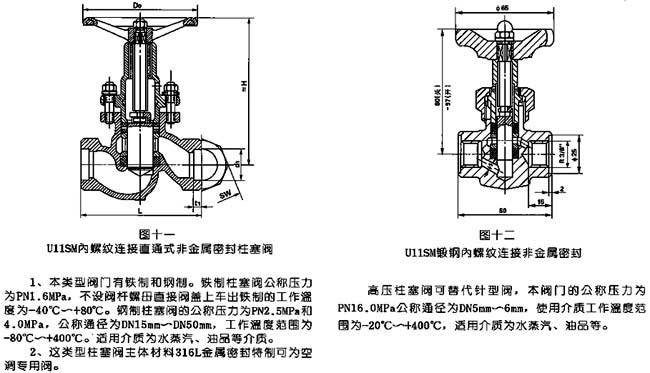 1. 鍛鋼高壓柱塞閥UJ41Y(H)有鐵和鋼制。鐵制柱塞閥公稱壓力為PN1。6Mpa,不設(shè)閥桿螺母直接閥蓋上車出鐵制的工作溫度為~40℃~+80℃。鋼制柱塞閥的公稱壓為PN2.5 Mpa和4.0 Mpa,公稱通徑為DN15㎜~DN50㎜,工作溫度范圍為-80℃!+400℃。適用介質(zhì)為水蒸汽、油品等介質(zhì)。